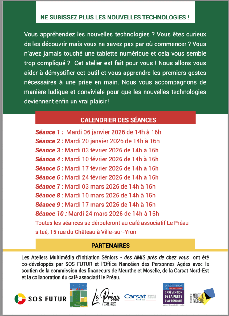13 décembre 2025 Actualité générale‚ Actus‚ Le Foyer Commentaires désactivés vsy-mairie ATELIERS « INITIATION A LA TABLETTE NUMERIQUE » POUR SENIORS (60ans et plus) Du mardi 06 janvier au mardi 24 mars 2026 Related Blog ATELIERS « INITIATION A LA TABLETTE NUMERIQUE » 13 décembre 2025 RETRAIT GONFLEMENT ARGILE -RGA- 13 décembre 2025 LES RENDEZ-VOUS DU PRÉAU, le Café 12 décembre 2025