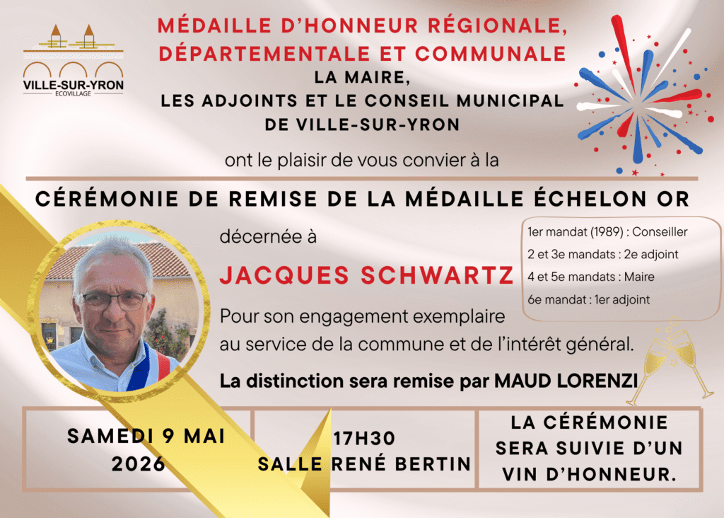 27 avril 2026 Actualité générale‚ Actus‚ Evénements Commentaires désactivés vsy-mairie CÉRÉMONIE DE REMISE DE LA MÉDAILLE OR DÉCERNÉE À JCQUES SCHWARTZ, LE 9 MAI à 17H30, salle René Bertin Related Blog LES RENDEZ-VOUS DU PRÉAU, le Café 27 avril 2026 CÉRÉMONIE DE REMISE DE LA MÉDAILLE 27 avril 2026 COMMÉMORATION DE L’ARMISTICE DU 8MAI, à 27 avril 2026